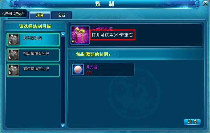 2:这项炼制主要是针对更新后修改的绑定和精炼功能的,一些玩家在更新前还留着不少的月光石和精炼石都可以在这里面进行兑换。