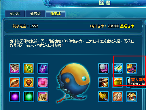 合成这款坐骑虽然的是收集不同部分的碎片,至于碎片的来源有两个,第一是每天领取的天降奇宝的活动中有几率开出,另外一个就是在除魔的仙玉林里面有几率获得相应的碎片了。