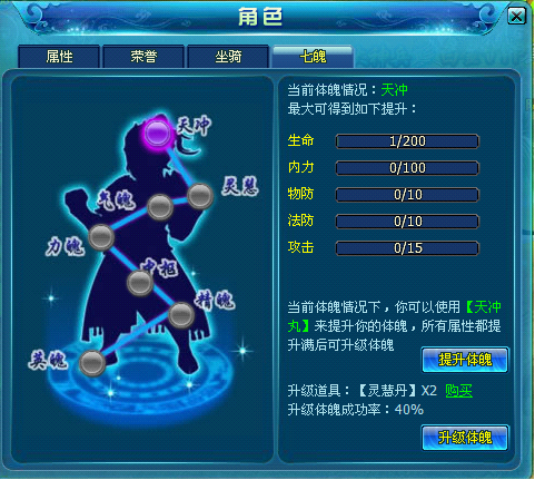 1、只有在天冲属性全部加满了之后,才可以使用灵慧丹进行升级达到下一级别,灵慧。以此类推。升级下一级别的体魄,存在机率的哦,40%的机率,这就要看人品了。