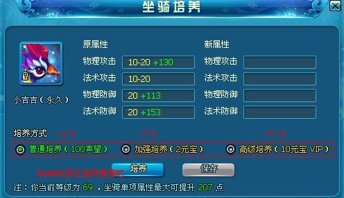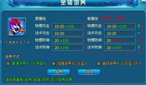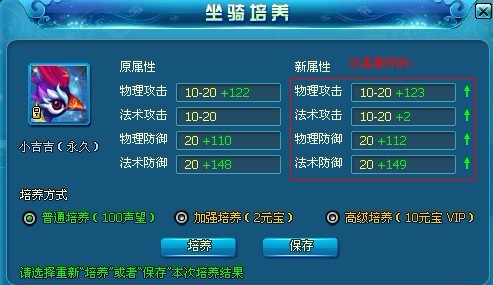 不需要花大量性质去解释如何培养坐骑,一针见血的说就是每次培养坐骑的附加值比上次附加的多就可以保存了