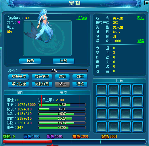 之前的话是通过新年活动和充值额活动赠送的披着羊皮的狼和美人鱼这两条独一无二的2100资质上限的宠物了。