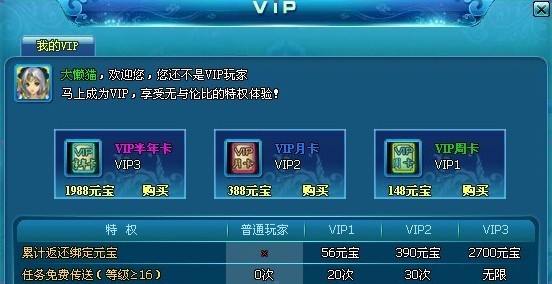 1、新人在前期升级过程中会得到游戏送的(VIP卡1小时),这时候别点使用!按F5刷新直接跳过前期不要使用 等到第一天的晚上11点55后使用最好!为什么了?现在我来解释下领到的VIP卡是1小时的当你开卡后系统会返还你8个绑定元宝!然后等过了12点系统刷 新后又能领8个绑定的元宝然后在利用VIP20次免费飞机的特权把循环任务做了~呵呵虽然只有8元宝!但是蚊子再小也是肉啊!
