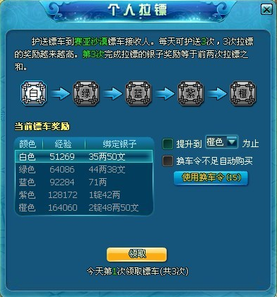 3、运镖的误区!好多玩家才运镖的时候第一辆就一直刷车~不是紫车不出发!其实第一辆接的镖车根本没必要刷!浪费换车令!非人玩家前期总共才40多个令!一定要最高效率的使用!我的办法是: