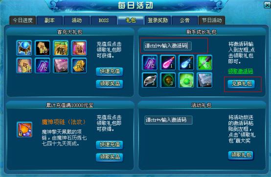2、在活动页面,选择礼包栏目,在新手成长栏里将刚才领取的激活码,黏贴在方框内,最后点击“兑换礼包”,这样礼包就会在背包里出现了。