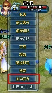 (2)在聊天频道,点击对方角色名,在弹出菜单中选择“添加好友”,发送加为好友请求;