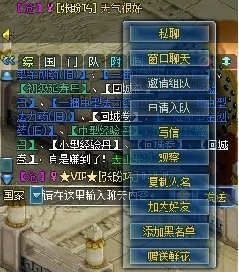 (1)聊天框点选角色名,会弹出一系列的菜单,你可以进行私聊、邀请组队、谢昕、观察、复制姓名、加为好友等等的操作。