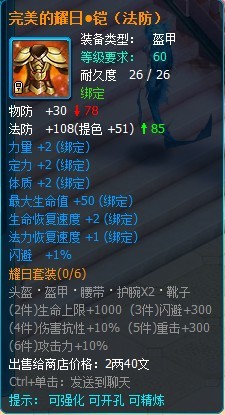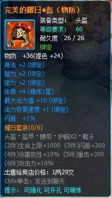 60级耀日套装:(防御装) 耀日套装属于40套装,通过挑战无忧环境副本,成功击杀BOSS后会有机率掉落耀日套装。 耀日盔: