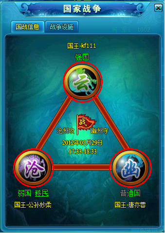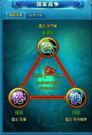 1、每周一至周五的0点到18点各国的国王可以向其他国家发起国战申请。每周每个国家只可发起一次国战,一个国家一周最多能打三场国战。