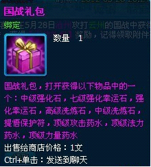 国战礼包使用可获得中级强化石、强化幸运符、中高级洗练石提悟保护符和各种顶级buff药水等等。