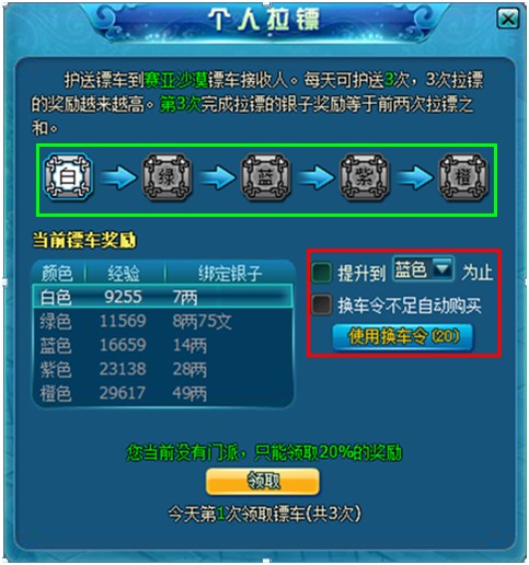 成功护送绿色镖车将获得白色镖车1.25倍的奖励。