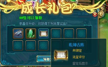 玩家等级达到60级后,可在60级等级礼包中获得第一个灵宝