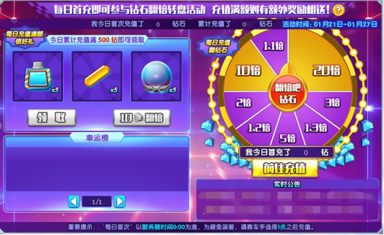 每日首次充值开启钻石翻倍转盘活动!将充值获得的钻石翻倍!