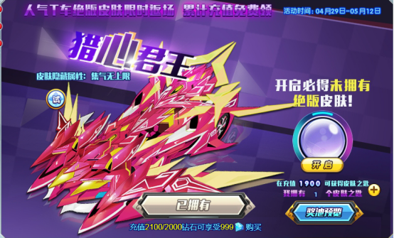 每次消耗30钻石,每期一辆赛车最高可参与20次抢购