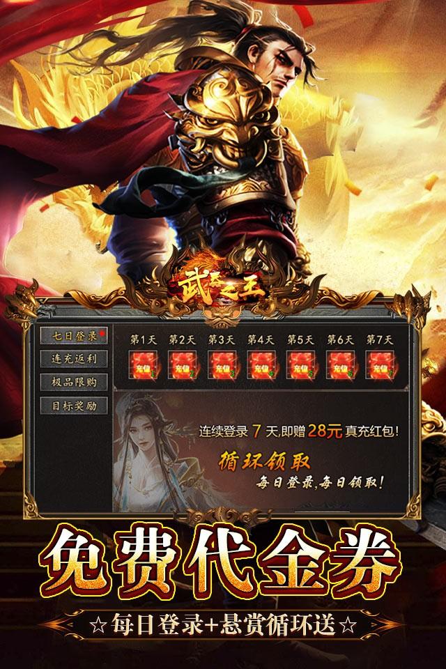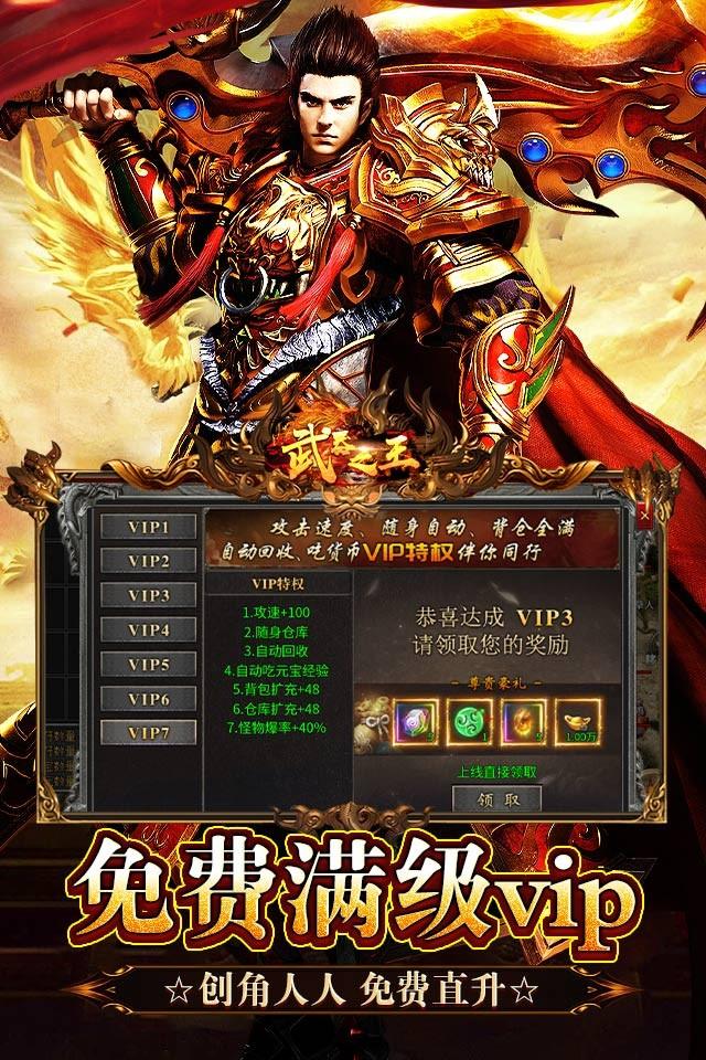 《武器之王》是一款以传奇为题材的角色扮演手游。特色三职业战士,神通各异,全新玩法丰富多彩;特色天命系统,赋予逆天属性,更多样化的战斗乐趣! 上线直接免费满级vip,每日登录即送代金券循环领取,可1:1抵扣所有充值礼包!野外地图全开放,装备全靠掉落,回归传奇本质,升级、打宝、PK、轻松愉悦,简单自由!