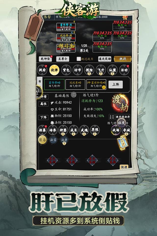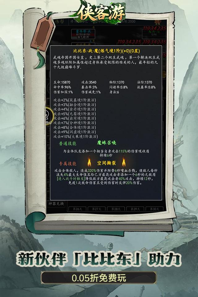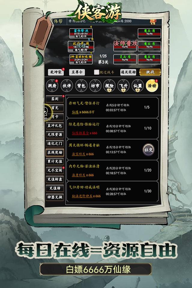 《侠客游(文字修真0.05折免费版)H5》是一款文字修仙的H5游戏,登录即领至尊灵液30亿、修为30亿,直接灌顶满级!任选6尊红色法身,搭配炎帝伙伴+神秘i坤·篮球和鸡,开局横扫三界!法身/法宝碎片6666、诸神徽章666、龙云套装*1——别人爆肝十年,你上线一秒成圣!
