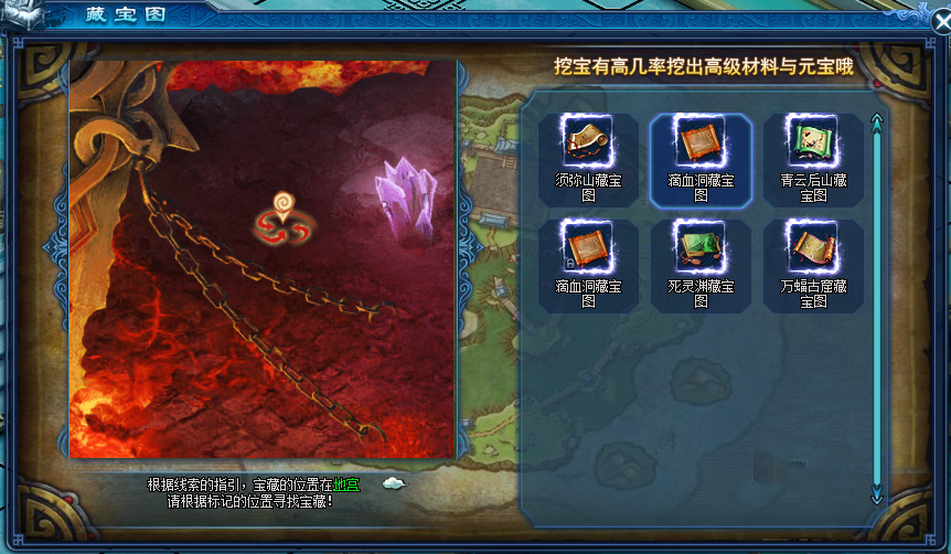 玩家可使用藏宝图获得寻宝线索,根据线索前往指定的地点进行挖宝。只有准确找到挖宝点,才能挖到宝物。