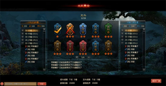 活动分为文斗和武斗,文斗是竞赛答题,武斗是竞技挑战!每个玩家参与文斗与武斗时,都会产生积分。以各自阵营的所有玩家积分之和来判定阵营的胜负,并给予双方玩家发放活动奖励!