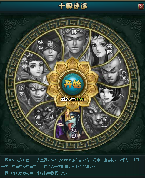 玩家借助封神榜的神通可穿梭游历十界。在十界中将会遇到形形色色的人和事,种种因果业障直指人心,做出每个选择之前请三思,不同的选择将会带来不同的后果。探访十界的次数每半小时可以恢复一次。