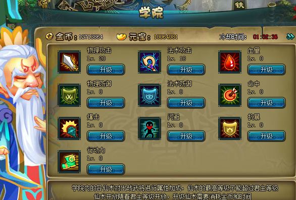 学院内研究的各项仙术会提高所有出战武将的属性,随着君主等级的提升将不断开放新的仙术项目。