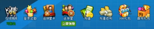 通过游戏页面上方的导航栏,可以报名在线挑战、查看到活动排行榜、购买礼包、领取登录奖励、升级送球员奖励等。