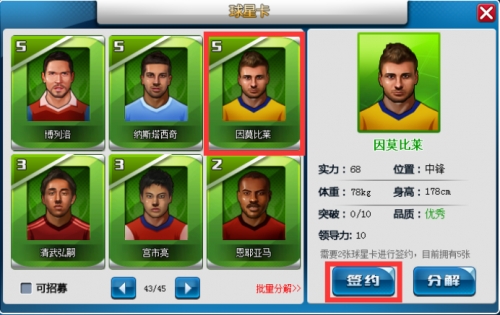 在卡片功能中,如果我们喜欢刚刚抽到的球员,则可以选中该组球星卡,并选择签约,让这名球员出现在我们的阵容当中