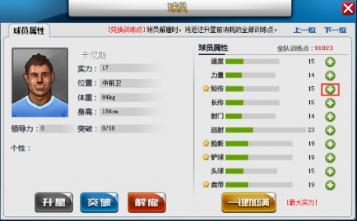 排兵布阵完毕,就需要对我们手下的大将们进行一番苦口婆心的鞭策了,他们进步了,球队的实力才会提升哦。 还是跟随新手指引,进入到“球员列表”。选择您要提升的球员,进入到该球员的属性对话框。带“星号”的是该球员的关键项属性,点击“加号”即可进行训练。