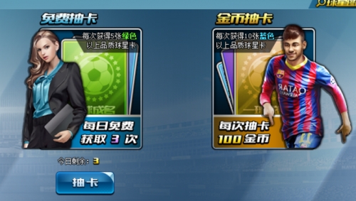 虽然有刚开始时候的球星助阵,但是还需要再拉拢几位帮手的,“抽球星卡”的界面中,每天有免费的3次抽卡次数,可以帮助玩家获得球星卡,签约球员,增强阵容实力